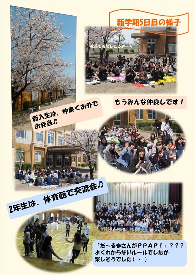 2017年04月19日(水) お知らせ クラス交流会の様子を掲載しました。 新学期が始まり、クラスで交流会を行ったときの様子です。 桜の木のしたで食べるお弁当は、さぞかしおいしかったのではないでしょうか(^^♪
