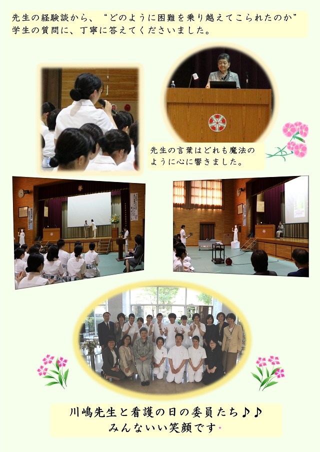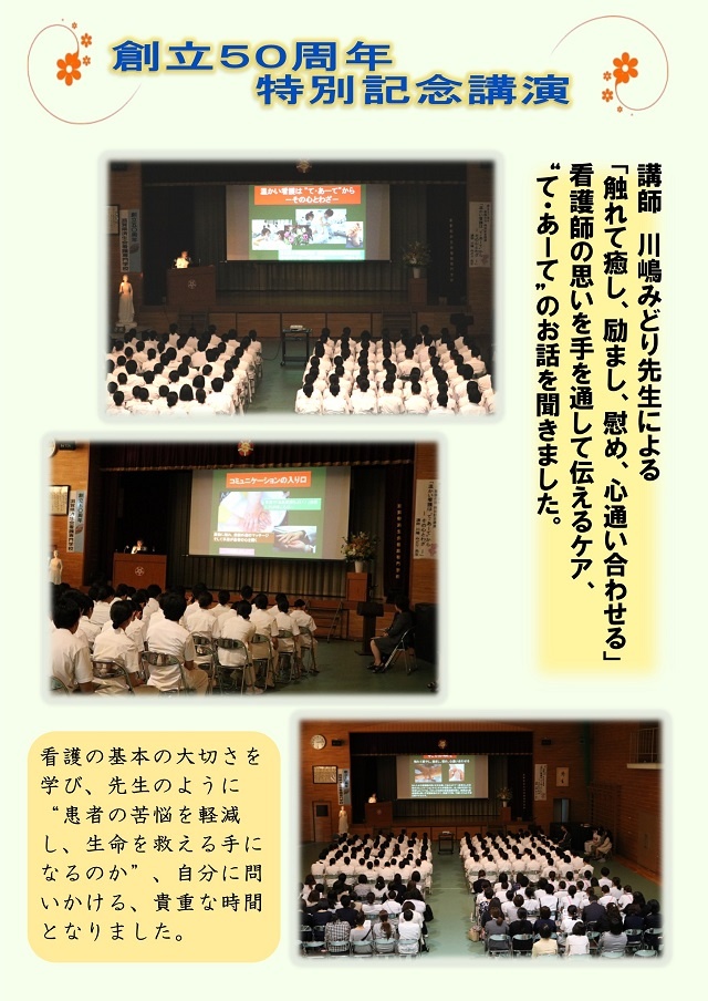 2017年05月01日(月) お知らせ 50周年記念講演を行いました。 本校は昭和42年に開校し本年創立50周年を迎える運びとなりました。 この節目の年を迎え川嶋みどり先生を講師にお招きして記念講演を開催しました。