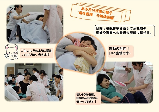 2017年07月11日(火) お知らせ ある日の授業の様子。パート5 看護第1学科 3年生の授業の様子です。 母性看護学では、分娩期の産婦の模擬体験を行い、産婦への援助などをグループごとに考え、まとめます。