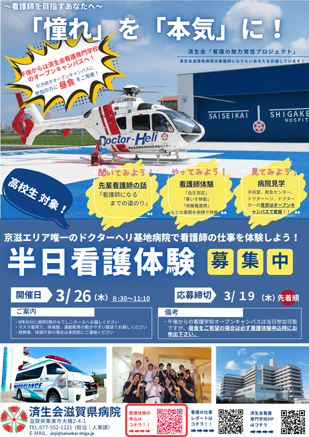 済生会滋賀県病院では3月26日に半日看護体験が行われます☆