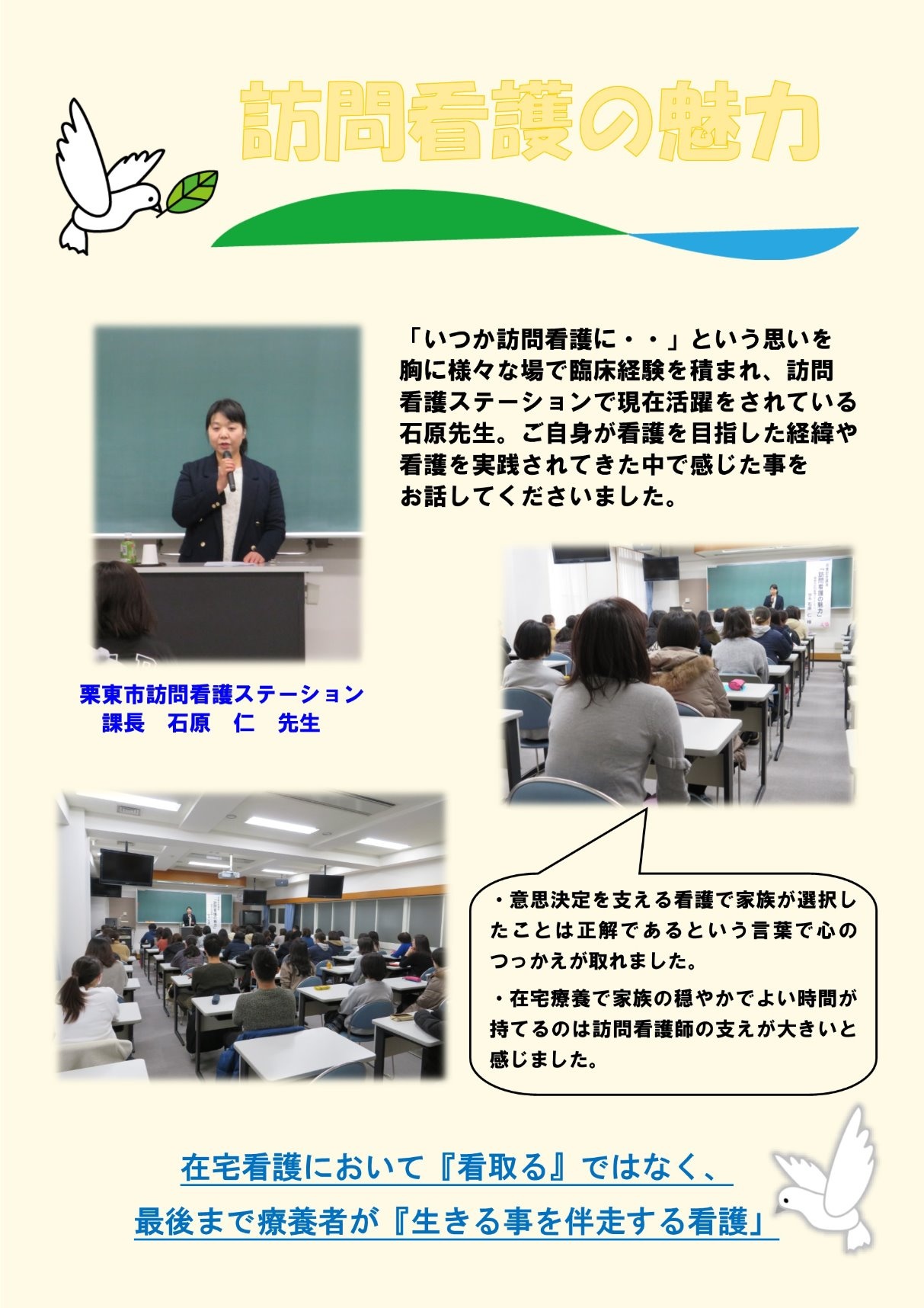 2020年02月27日(木) 学校の様子 < お知らせ 「訪問看護の魅力」の講演会が行われました。 卒業記念講演として栗東市訪問看護ステーションの石原先生より「訪問看護の魅力」の お話をしていただきました。訪問看護の魅力につて、人生の最期をその人らしく過ごせるように 見守る看護、療養者や家族の意思決定を支える看護などからお話してくださいました。